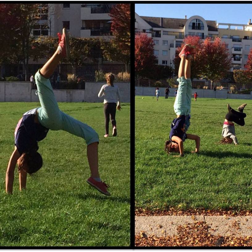 Sur mon banc, profitant des doux rayons du soleil, j’admire Capucine (ben oui, c’est ma fille !) : Roues, ponts, poiriers, grands écarts, et autres acrobaties de son âge.